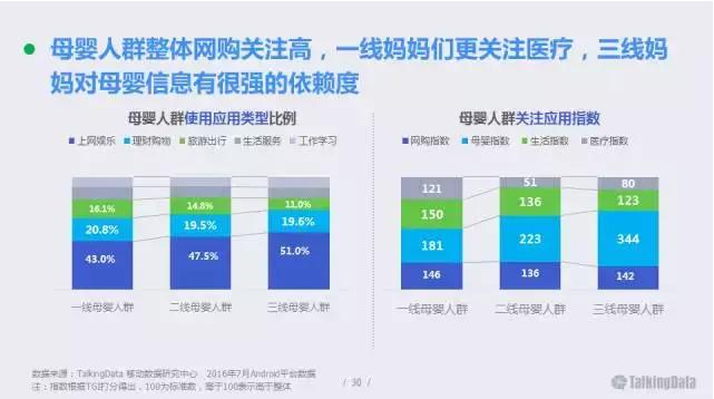 母嬰人群整體網(wǎng)購關(guān)注高,一線城市媽媽們更關(guān)注醫(yī)療,三線城市媽媽對(duì)母嬰信息有很強(qiáng)的依賴度。