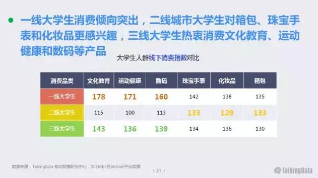 一線大學(xué)生消費(fèi)傾向突出,二線城市大學(xué)生對(duì)箱包、珠寶手表和化妝品更感興趣,三線大學(xué)生熱衷消費(fèi)文化教育、運(yùn)動(dòng)健康和數(shù)碼等產(chǎn)品。