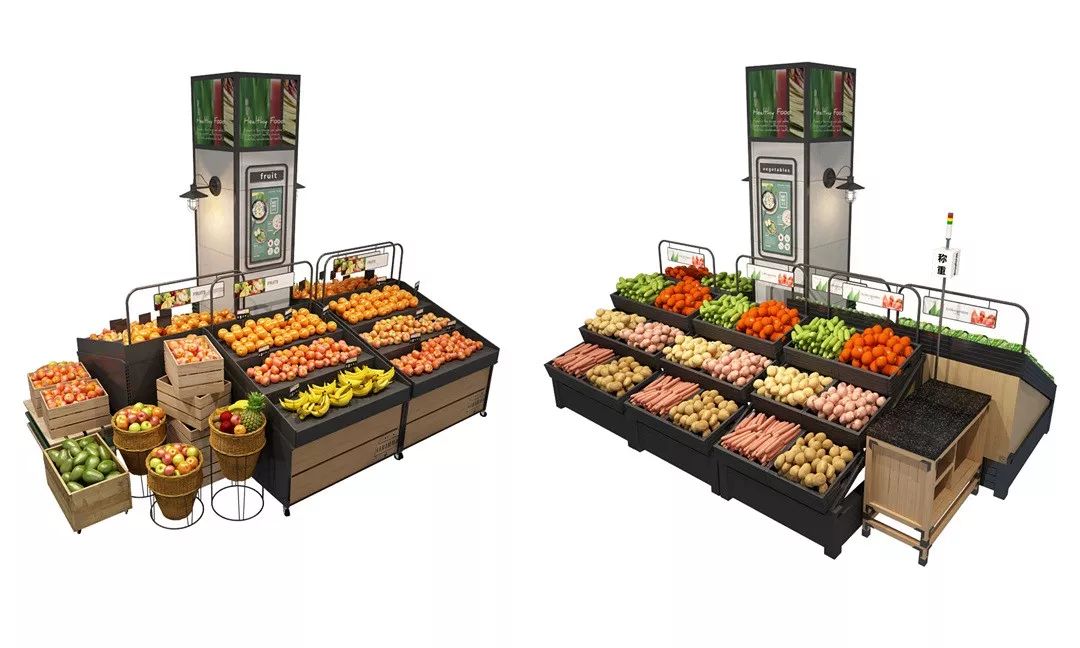 此次升級(jí)更豐富了貨架設(shè)計(jì)和陳列方式,給客戶以靈動(dòng)多變的購物體驗(yàn),生鮮區(qū)域使用了多層蔬果架,以小小面積承載更多商品,并能在視覺上營造出豐富多彩的效果。
