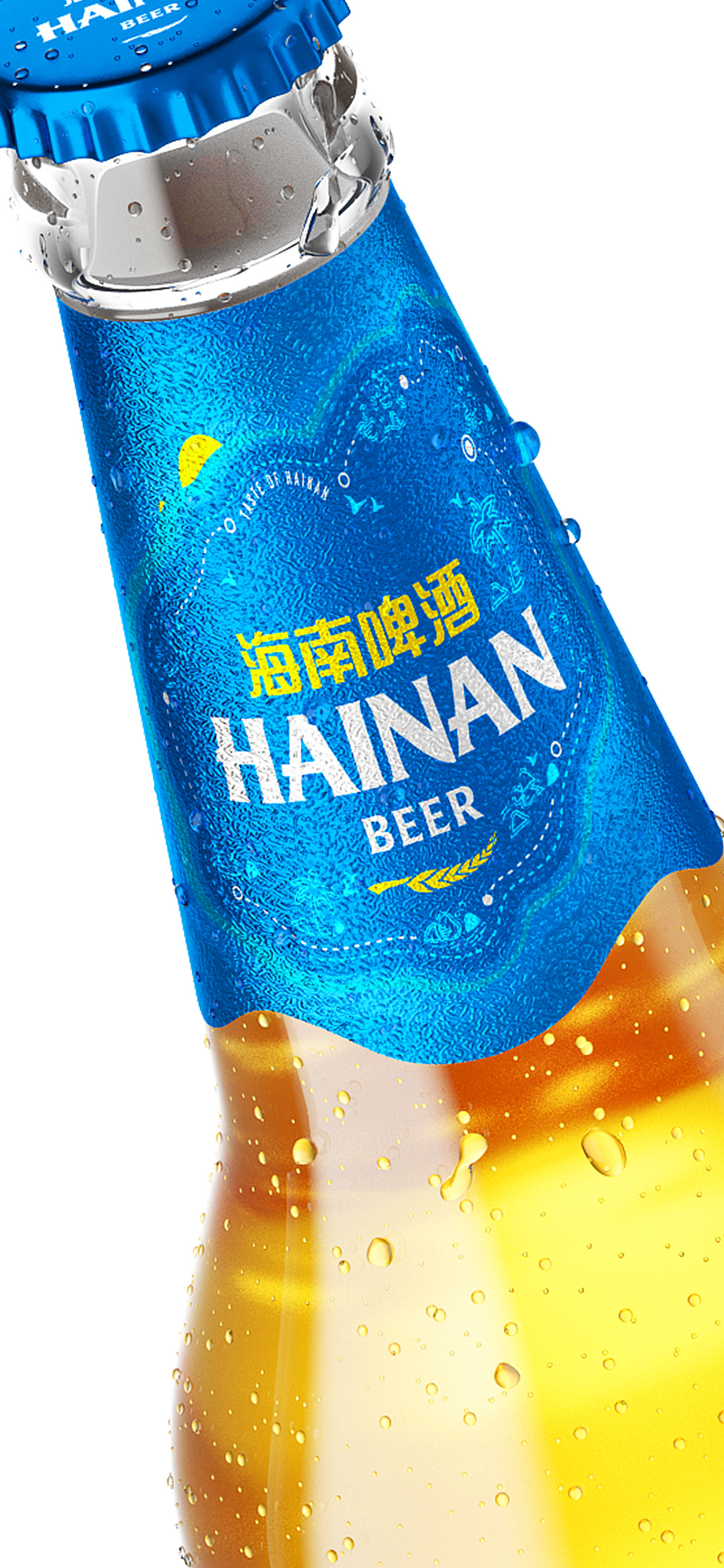 海南啤酒的包裝設(shè)計創(chuàng)意靈感來自于“浪”,結(jié)合海南本土元素再設(shè)計,提取海浪、海鷗的形狀,通過文字變形處理,將元素以圖像化表現(xiàn),賦予海南啤酒的新鮮活力。圓潤、律動的圖形文字,體現(xiàn)海南的舒適自由度,將悠然愜意的感覺融入設(shè)計之中。主圖形放大化,突破常規(guī)設(shè)計局限,形成強烈的視覺沖擊力。